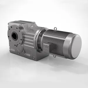 Выходной вал редуктора серии GK перпендикулярен к входному, двигатель состоит из двуступенчатых косозубых колес и одноступенчатых конических шестерен.